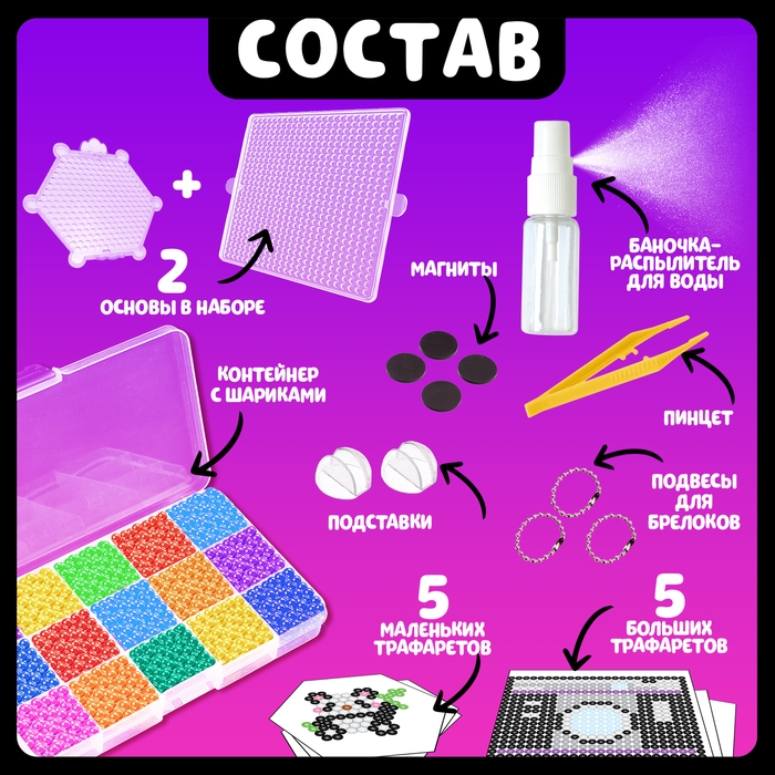 С аквамозаикой от торговой марки «Эврики» ребёнок соберёт объёмные фигурки из шариков-пикселей. Детали плотно скрепляются друг с другом. С поделками можно играть или носить с собой как брелоки.
