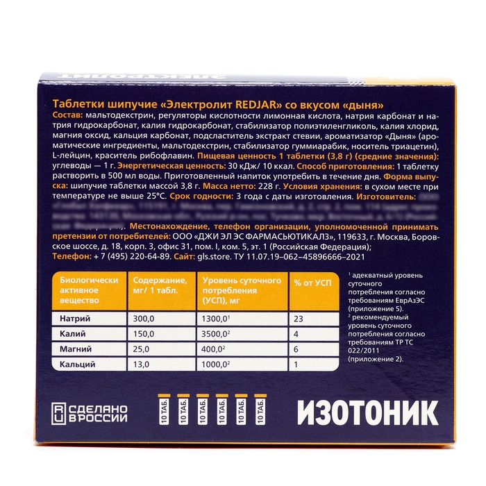 - Изотоник "Электролит REDJAR", 10 шипучих таблеток массой 3,8 г