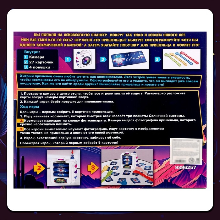 «Хитрый пришелец» — настольная игра для детей от 3 лет. Настолка перенесёт малыша в захватывающее путешествие по необъятному и таинственному космосу. Ребёнок попадёт на неизвестную планету, где живут её загадочные обитатели.