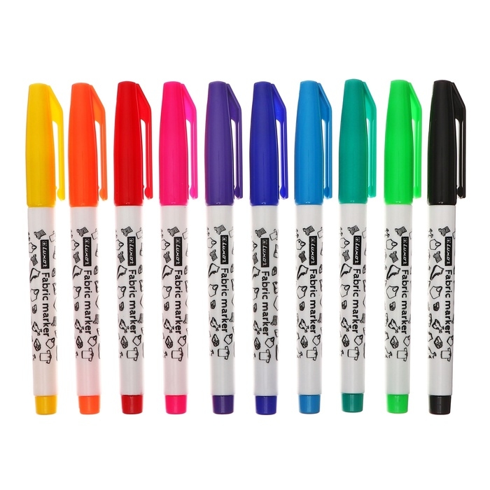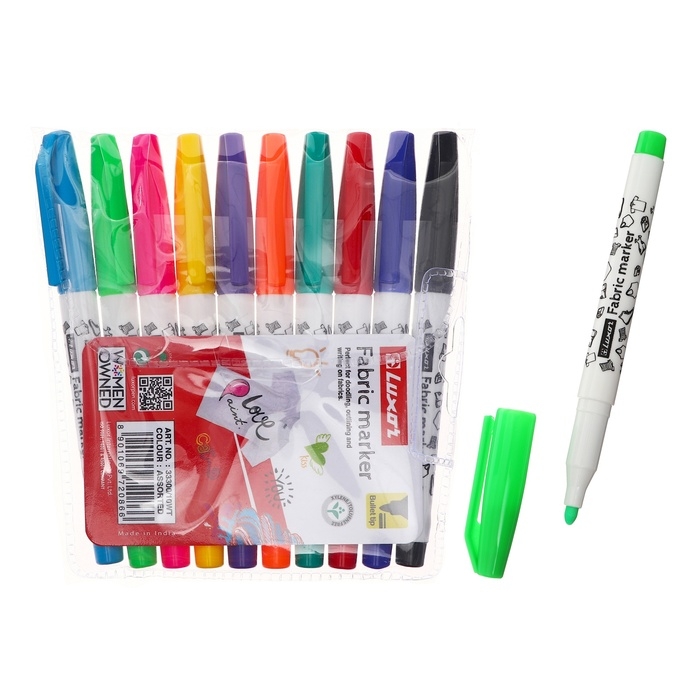 Маркеры для ткани Luxor "Fabric", подходят для различных видов тканей: от хлопковых сумок и футболок, до интерьерных тканей. Идеальны для дизайнеров по текстилю. Цвета автоматически закрепляются через 24 часа, или после глажки. Не смазываются при стирке 40°C (в зависимости от типа ткани и содержания натуральных волокон). Ручная стирка должна быть более бережной. Маркер имеет круглую форму корпуса и водостойкие пигментированные чернила на водной основе. Не токсичны. Не выцветают после многих стирок. Пишущий узел-1-2 мм. Набор состоит из 10 ярких цветов: черный, синий, красный, зеленый, оранжевый, фиолетовый, желтый, розовый, салатовый, голубой. ПВХ упаковка с европодвесом