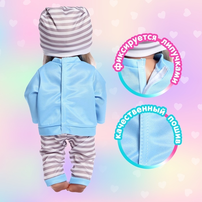 Замечательный комплект одежды для любимого пупса. Штаны, кофточка и шапочка позволят вашей кукле чувствовать себя уютно и комфортно. Этот набор разработан специально для кукол ростом от 37 до 40 см.