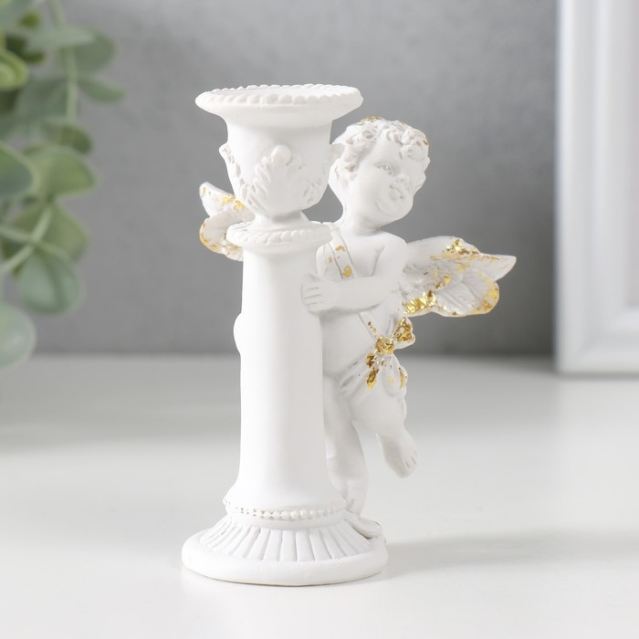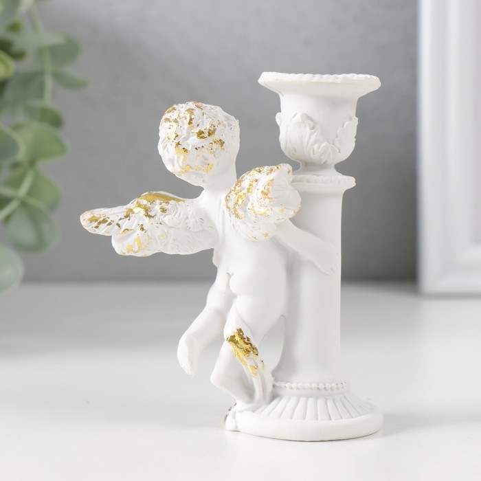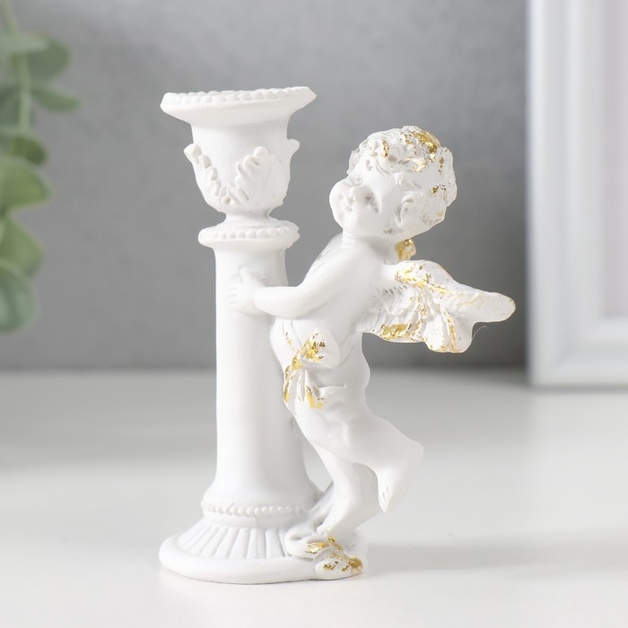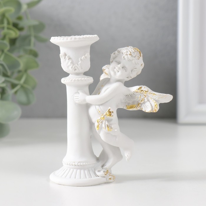 Подсвечник полистоун на 1 свечу "Ангел на колонне" d-1,2 см белый с золотом 9,8х8х7 см