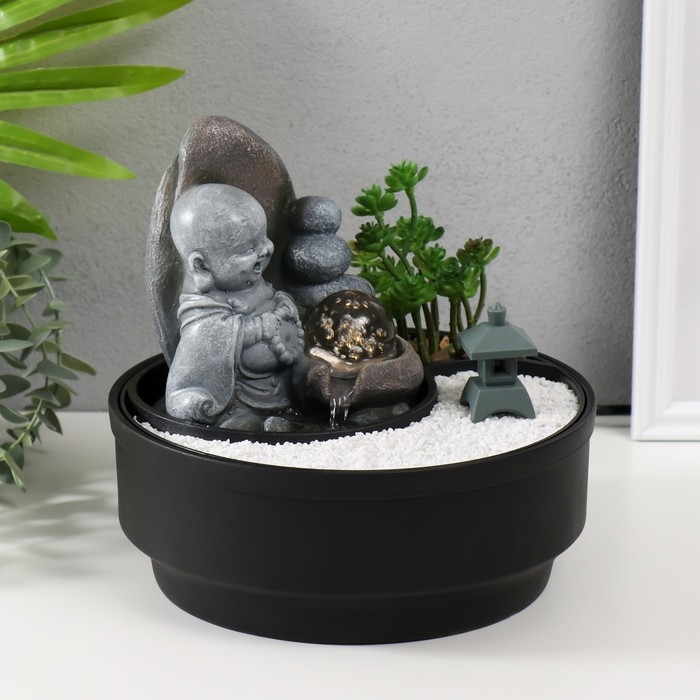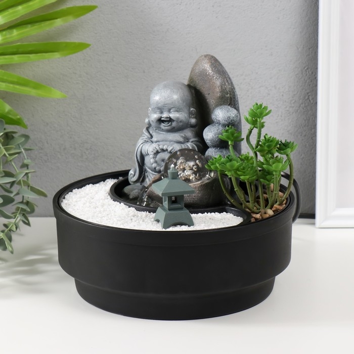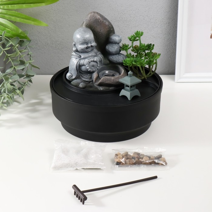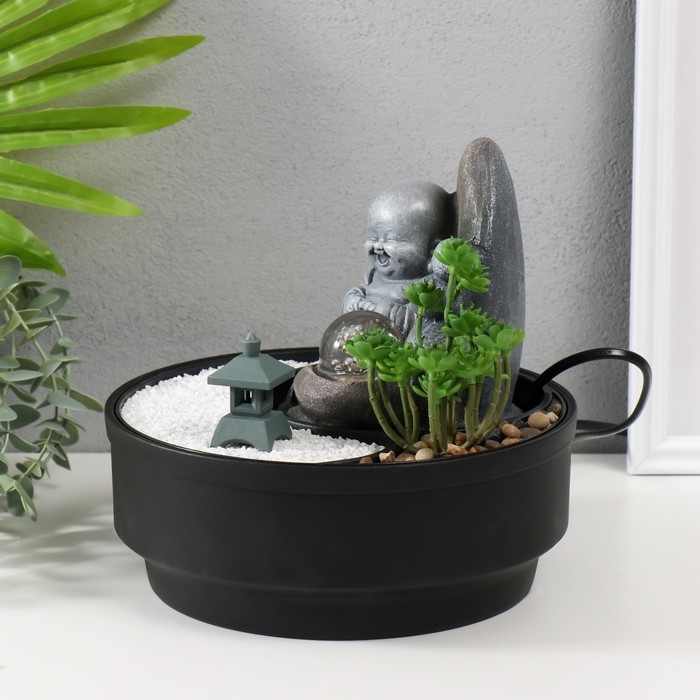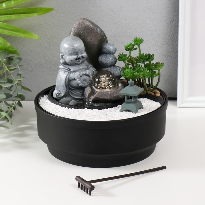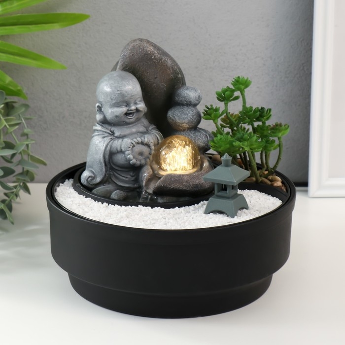 Фонтан настольный от сети, подсветка "Маленький хотей в саду Дзен" 21х21х21 см
