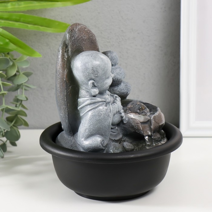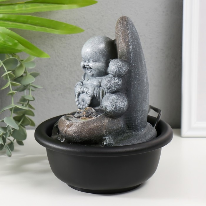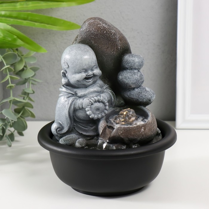 Фонтан настольный от сети, подсветка "Маленький хотей с чётками у скалы" 16х16х19 см