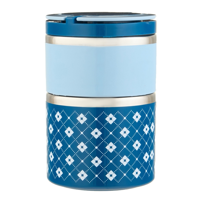Ланч-бокс - это ручной контейнер для пищевых продуктов, используемый для транспортировки еды. Этот стильный и функциональный аксессуар станет незаменимым помощником в повседневной жизни. Среди разнообразия термопосуды ланч-бокс из металлической основы внутри - одна из популярных и универсальных моделей. Ланч-бокс из нержавеющей стали в пластиковом корпусе не содержит вредных веществ и безопасен для здоровья. Особенностью этого ланч-бокса является то, что он состоит из двух отдельных контейнеров. Это очень удобно, так как вы можете взять с собой два разных блюда или разделить одно блюдо на две порции. Между собой секции собираются как "конструктор" через защелки. Благодаря плотно закрывающейся крышке и специальным зажимам, контейнер надежно сохраняет свежесть и аромат ваших блюд, предотвращая протекание и рассыпание. Легкий и компактный размер, позволяет удобно разместить ланч-бокс в сумке или рюкзаке, а приятный синий цвет с голубыми элементами добавит красок в ваш день. Имеется ручка для переноски. Контейнер отлично подходит для любых типов пищи, включая супы, вторые блюда, салаты и десерты. Обеспечивает надёжное сохранение температуры пищи в течение двух часов. Это позволит вам наслаждаться горячими блюдами даже спустя некоторое время после их приготовления, сохраняя их вкусовые качества и полезные свойства. Посуда имеет силиконовую вставку по периметру крышки и клапан, которые обеспечивают герметичность отделения. Клапан на крышке служит для выпуска пара для более легкого открытия контейнера после нахождения в нем горячей пищи.