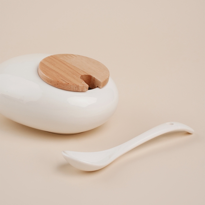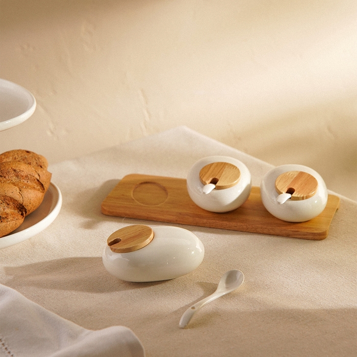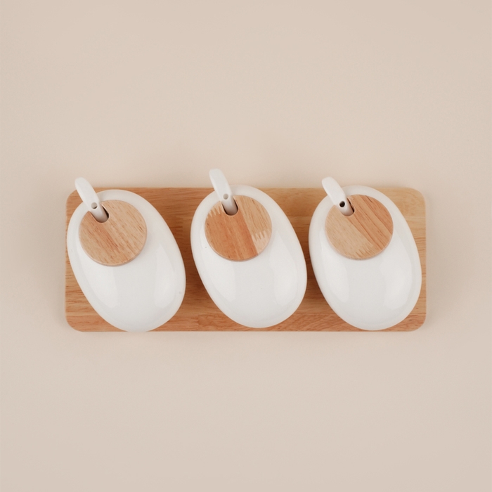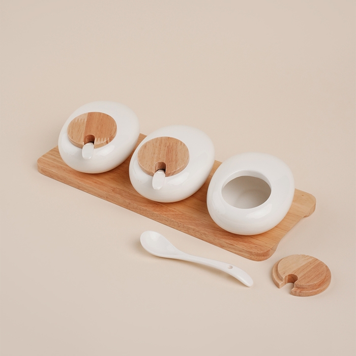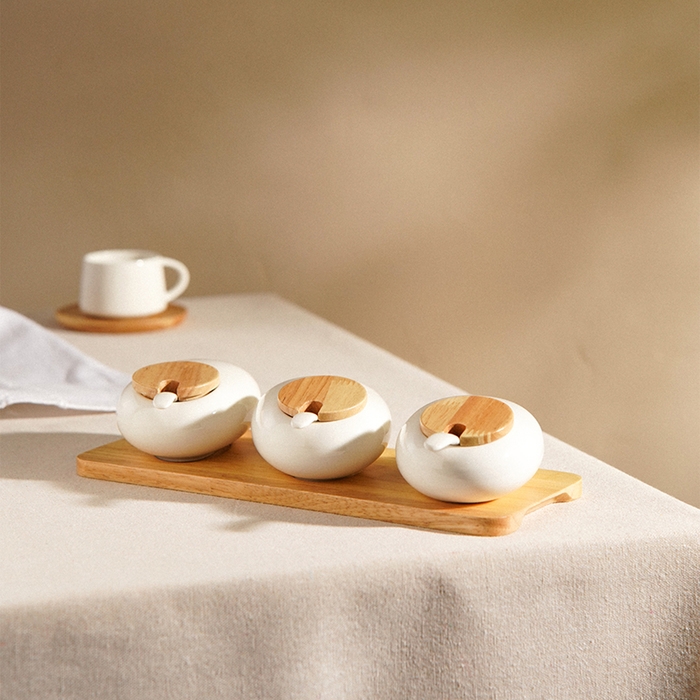 Каждая банка имеет гладкую текстуру, что облегчает уход за ними. Деревянные крышки без герметизации обеспечивают удобный доступ к содержимому, а включенные ложки позволяют аккуратно дозировать продукты. Подставка обеспечивает надёжное и компактное размещение набора на столе или кухонной полке.