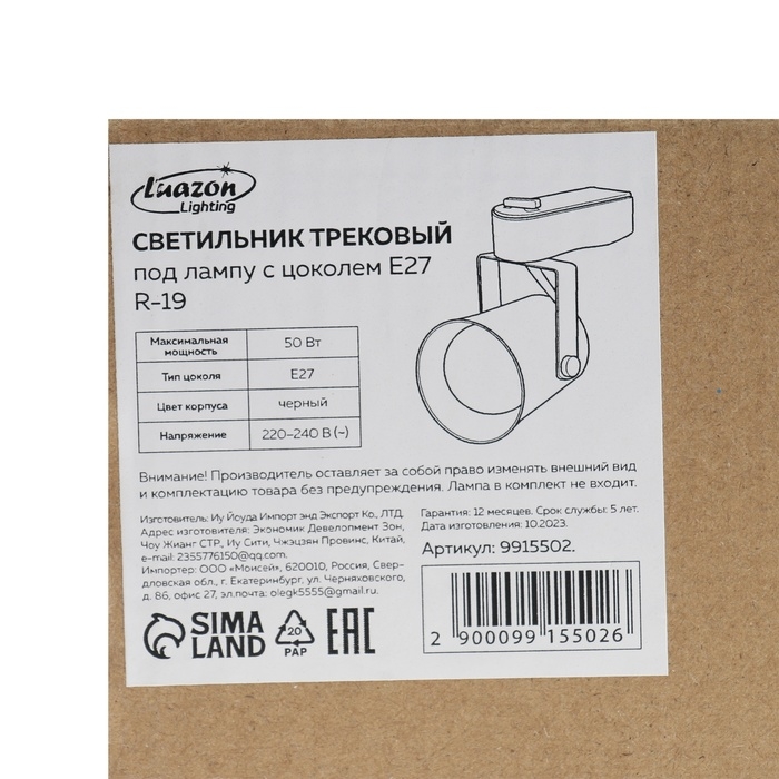 Трековый светильник под лампу E27, 50 Вт, корпус черный