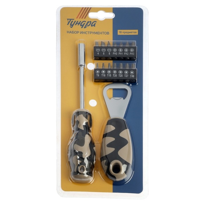 Набор инструментов в блистере ТУНДРА, открывашка, отвертка с битами, 16 предметов