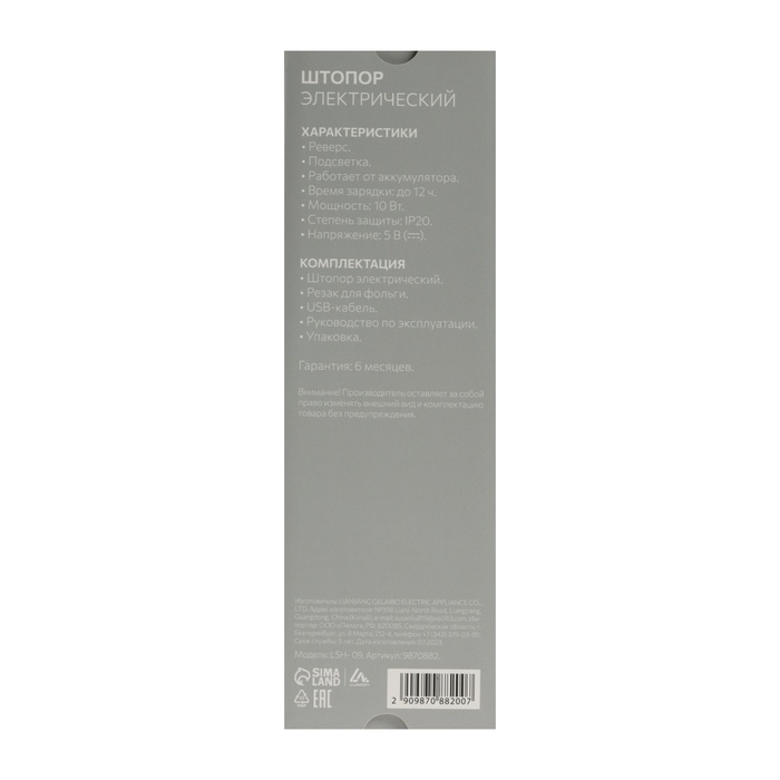 Штопор электрический Luazon LSH- 09, 10 Вт, АКБ, резак для фольги, черный