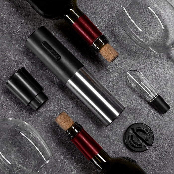 Набор сомелье Luazon LSH-08 станет хорошим подарком для ценителей благородного напитка. В набор входят все необходимые составляющие для работы с вином: электрический штопор, резак для фольги, аэратор и пробка с таймером.