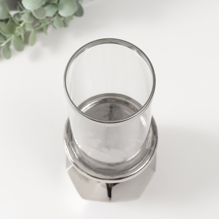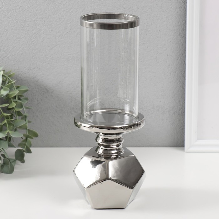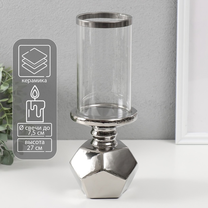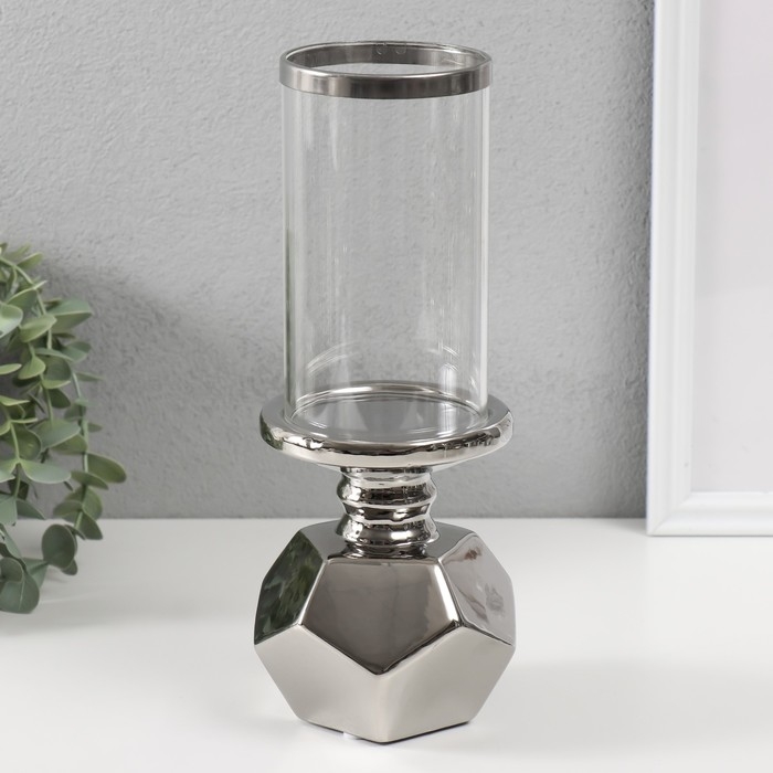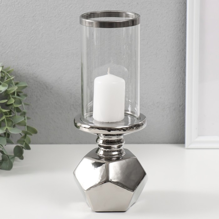 Подсвечник керамика, стекло на 1 свечу "Грани" d=7,5 см серебро 10,5х10,5х27 см