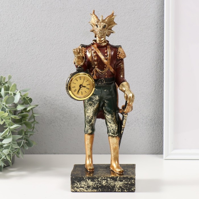 Сувенир полистоун с часами "Золотистый дракон в камзоле, со шпагой" 12х9х32 см