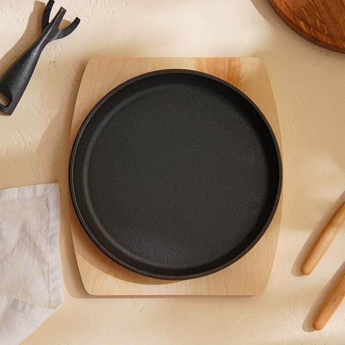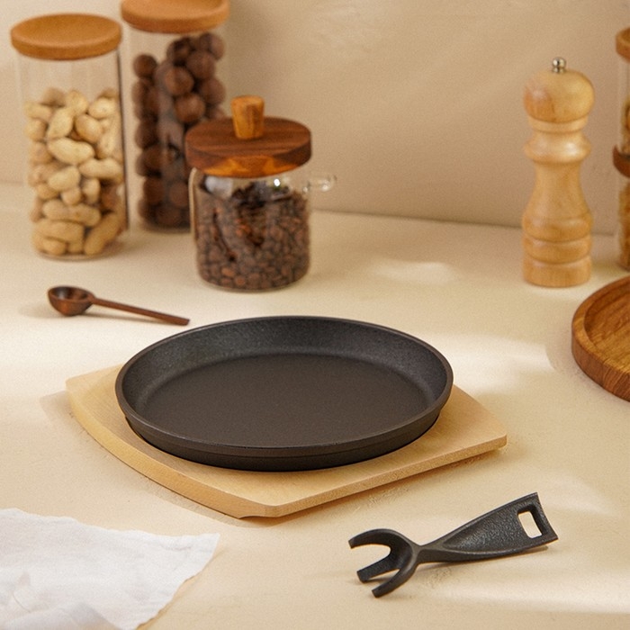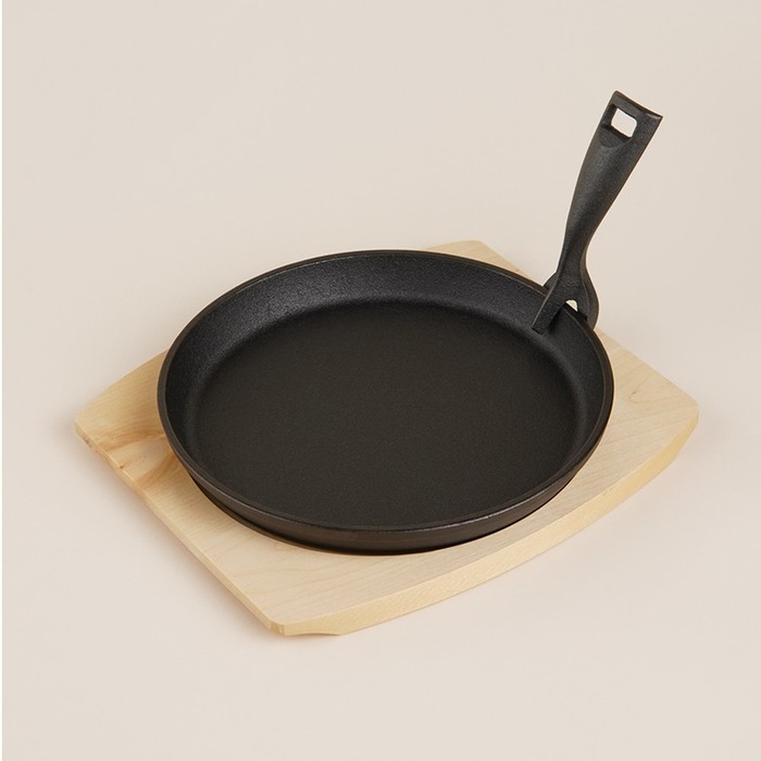 Главной особенностью этой сковороды является её натуральная деревянная подставка, которая не только добавляет эстетики, но и защищает поверхность вашего стола от горячей посуды. Чугун, из которого изготовлена сковорода, гарантирует долговечность и устойчивость к износу, а также естественные антипригарные свойства, которые улучшаются с каждым использованием.