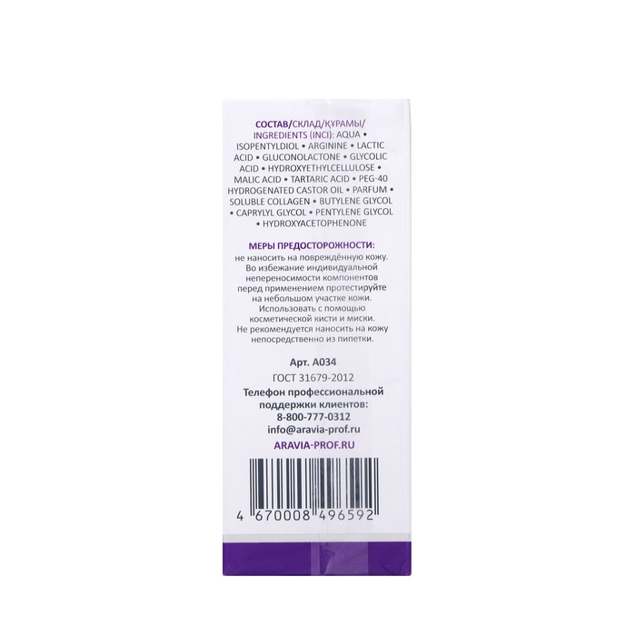 Биоактивный состав: молочная кислота, гликолевая кислота, винная кислота, коллаген, яблочная кислота, глюконовая PHA кислота, аргинин.