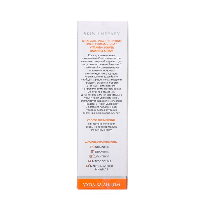 Крем для сияния кожи с витамином С выравнивает тон, наполняет энергией и делает цвет лица заметно свежее. Витамин С стабильной формы является мощным природным антиоксидантом, защищает клетки кожи от воздействия свободных радикалов, замедляет процессы старения, борется с пигментными пятнами и с проявлениями фотостарения. Сочетание витамина Е, Д-пантенола и масел значительно увеличивает упругость кожи, стимулирует выработку коллагена и эластина. Крем увлажняет и помогает поддерживать уровень влаги в глубоких слоях кожи. Подходит с 25 лет.