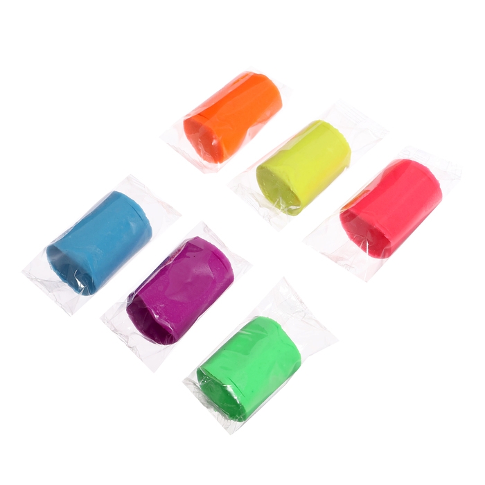 - В наборе пластилин разных цветов: оранжевый, жёлтый, розовый, голубой, фиолетовый и зелёный.