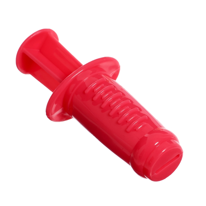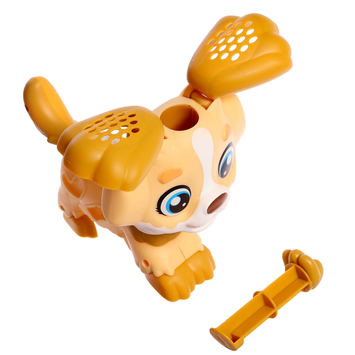 - Чтобы собачка показала язык, положите розовый пластилин в голову игрушки и надавите специальным прессом.