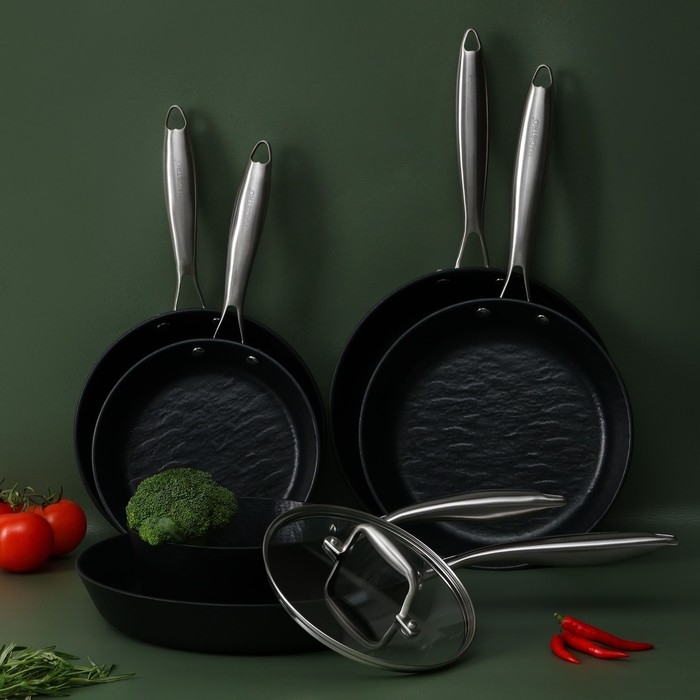 - Имеют антипригарное покрытие Greblone C3, которое предотвращает пригорание пищи и облегчает уход за сковородами.