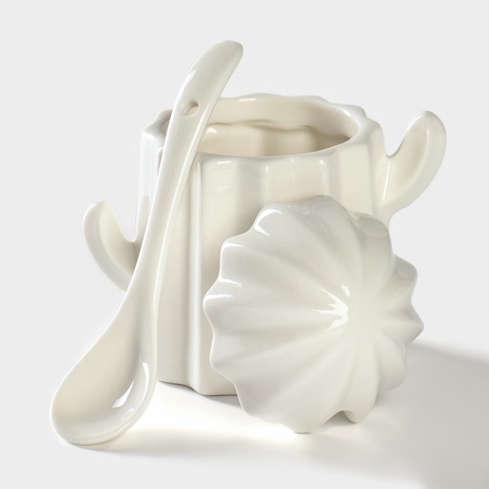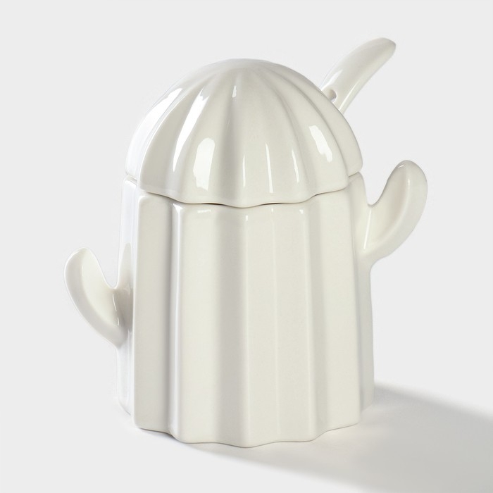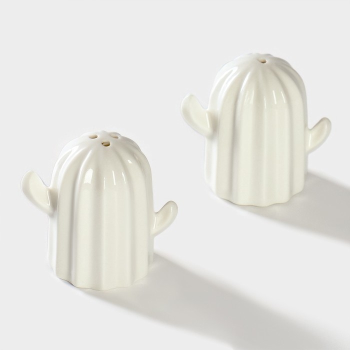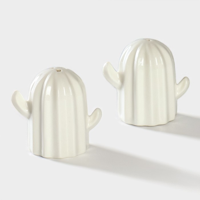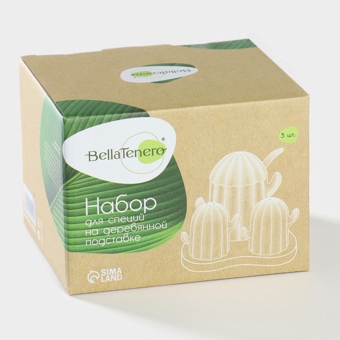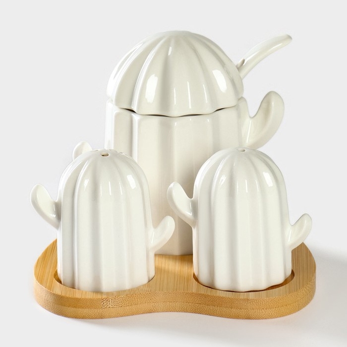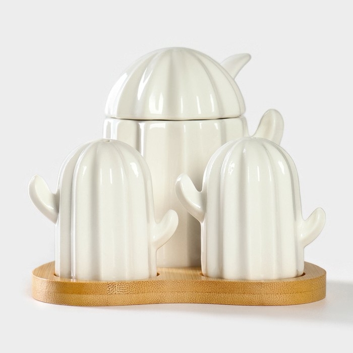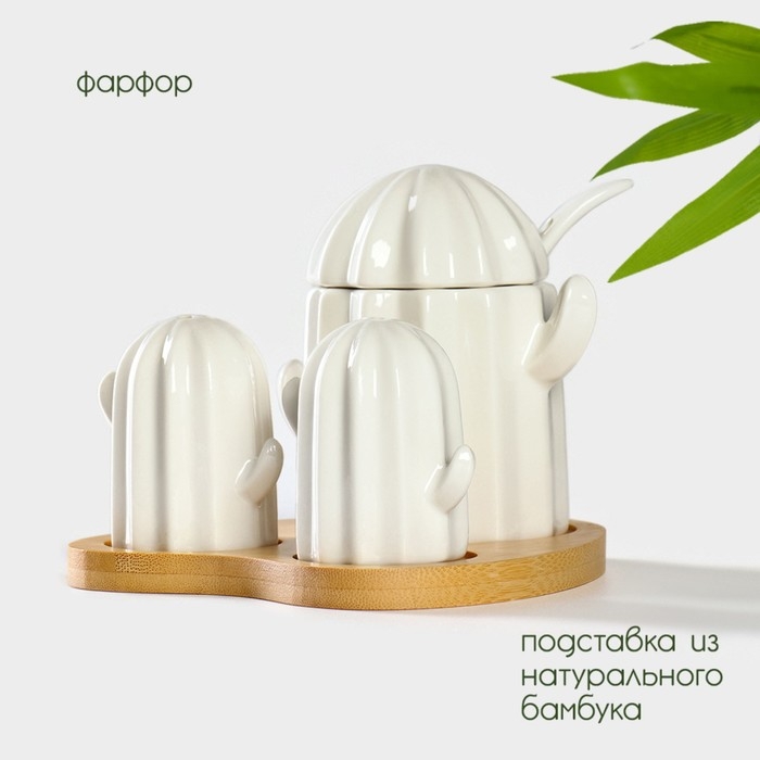 Набор фарфоровый для специй на подставке из бамбука BellaTenero «Кактусы», 12×12,5×10 см, цвет белый