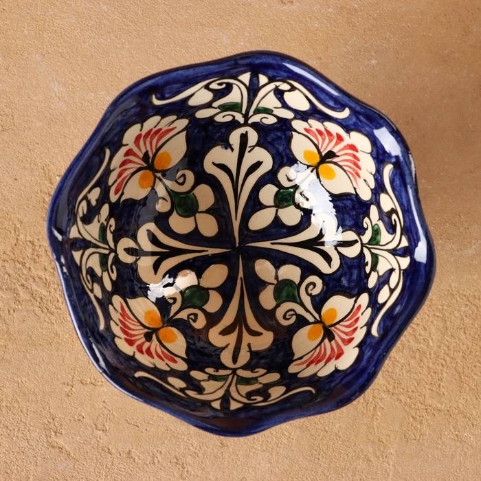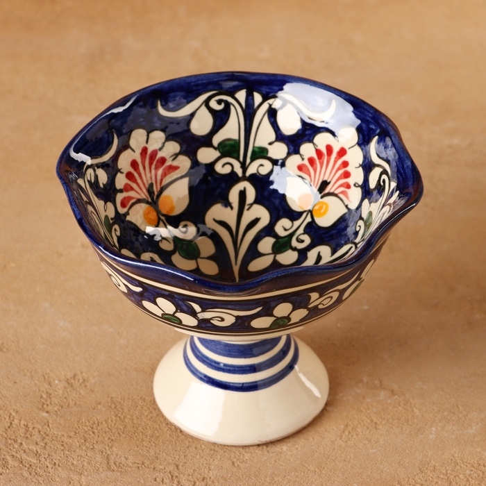 Конфетница Риштанская Керамика "Цветы", синяя 14 см,