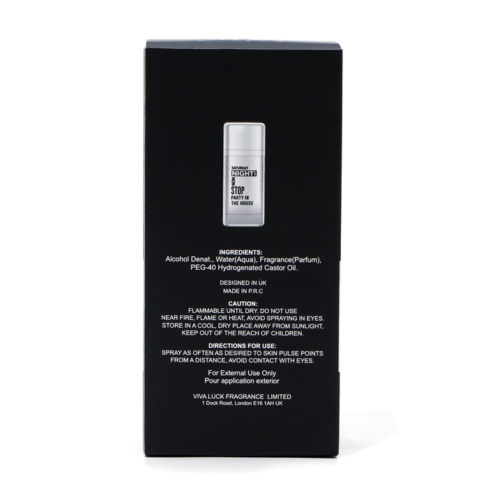 Туалетная вода Saturday Night – это яркий, бодрящий и чарующий аромат, ориентированный на мужчин, живущих в ритме большого города. Обладатель парфюма является душой любой вечеринки, всеобщем любимцем, у которого много друзей и тайных поклонниц. Он умеет создать атмосферу праздника и безудержного веселья в любой ситуации, вдохновляя окружающих и заряжая их позитивом. С ним можно отправиться на край света, потому что путешествие гарантировано станет самым ярким и эмоциональным событием в жизни.