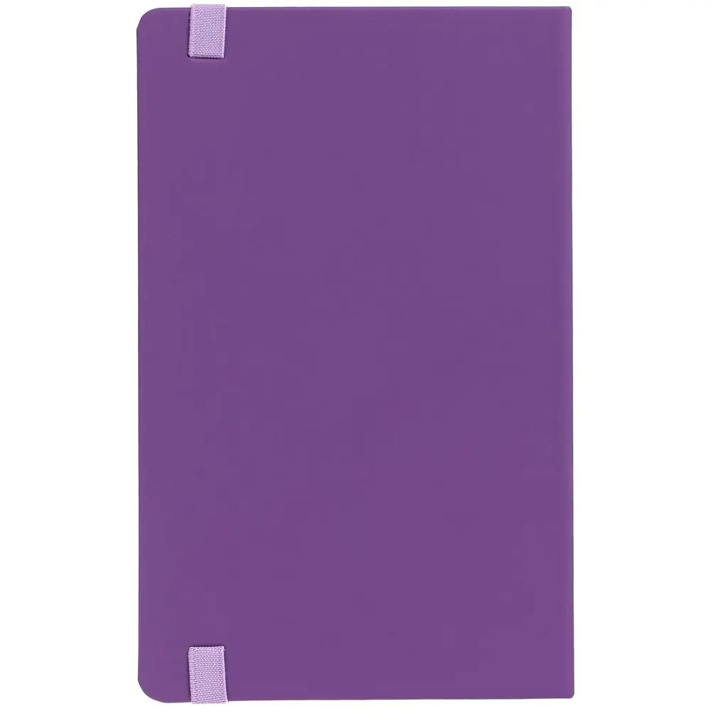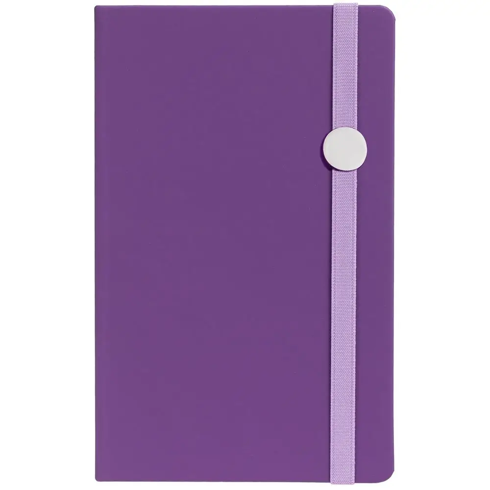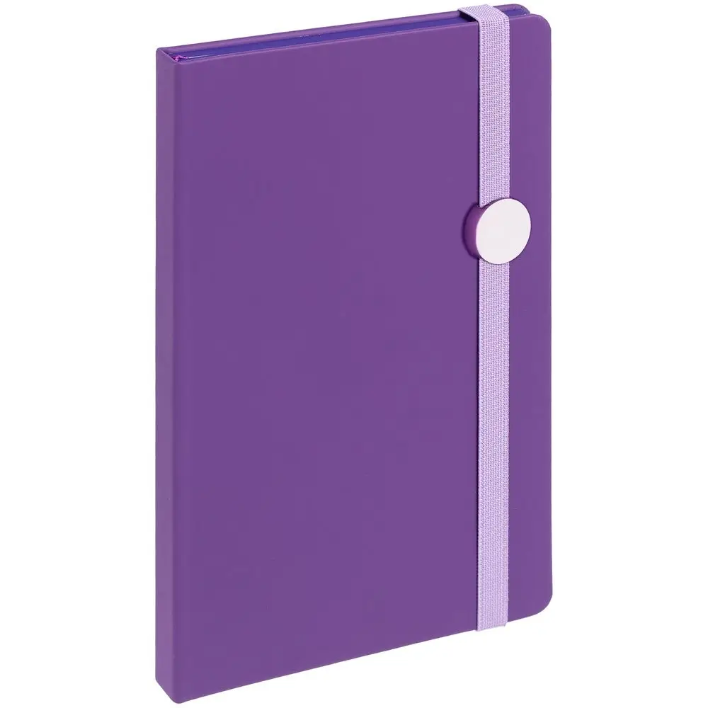 Блокнот в твердой обложке, выполнен из материала Soft Touch, фиолетовый UU, дополнен резинкой и ляссе в цвет обложки.