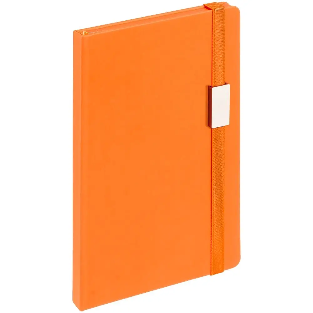 Блокнот в твердой обложке, выполнен из материала Soft Touch, оранжевый ОО, дополнен резинкой и ляссе в цвет обложки.