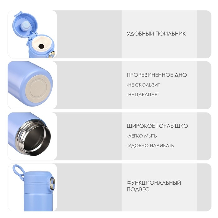 Термокружка сделана из нержавеющей стали марки 304, сконструирована по вакуумной технологии, с двойной стенкой, следовательно, долго держит тепло и не проливается. Оснащена откидывающейся крышкой, изготовленной из экологичного пищевого пластика. На дне термокружка имеет специальную прорезиненную основу, предотвращающую царапины на поверхностях.