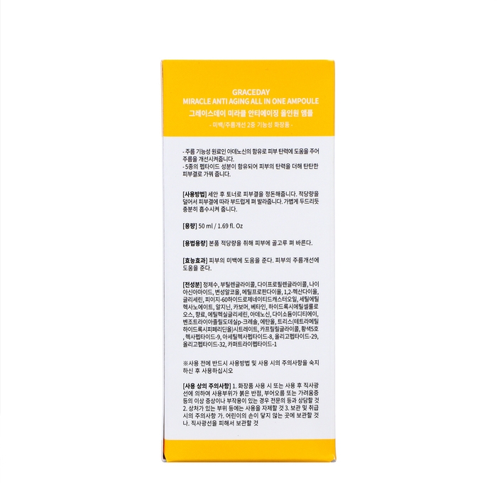 Для омолаживающего ухода за лицом специалисты Grace Day предлагают использовать сыворотку Miracle Anti Aging All In One Ampoule, которая обогащена пептидами и другими биоактивными веществами для интенсивного комплексного ухода за возрастными покровами. Проникая вместе с впитывающейся сыворотку в толщу эпидермиса, полезные вещества улучшают состояние кожи и снаружи, и изнутри. Пептиды активизируют выработку коллагена и эластина, улучшают обмен веществ, поддерживают процессы клеточного обновления и повышают защищенность тканей от негативного влияния внешней среды. Пептидный комплекс с 5 компонентами работает в сочетании с аденозином. Сыворотка разглаживает морщины, повышает упругость и эластичность эпидермиса.