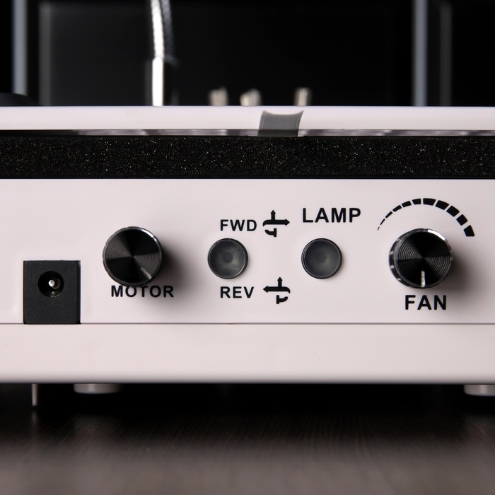 Понятная панель управления оборудована всем необходимым. Вы можете регулировать работу всех элементов устройства: включать лампу и пылесос, плавно регулировать скорость вращения фрез и мощность всасывания пылесоса, а также выбирать направление вращения фрез. Многообразие и простота - это отличительные особенности аппарата для маникюра.