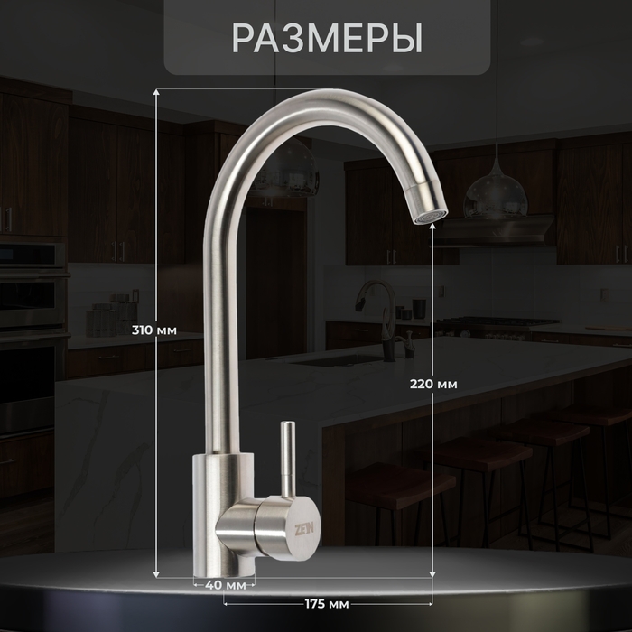 Смеситель для кухни ZEIN Z3827, однорычажный, высота излива 26 см, сатин