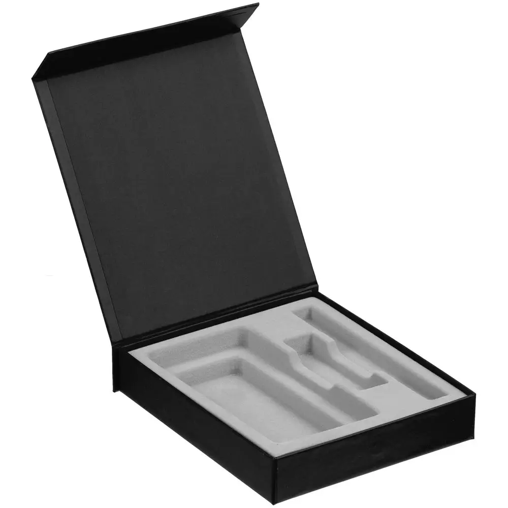 Подарочная коробка для аккумулятора 14,5х7,5х1,3 см, флешки 8,2х2,2х1,2 см и ручки 14,5х1,5х0,8 см с крышкой на магните и флокированным ложементом.