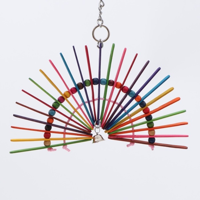 Оригинальный дизайн игрушки с вращающимся веером, украшенным яркими бусинами, не оставит равнодушным даже самого привередливого питомца. Колокольчик, закрепленный в центре, добавляет веселья — при любом движении веера он издаёт звон, привлекая внимание и стимулируя птицу к активности.