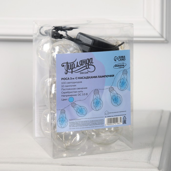 Гирлянда «Нить» 3 м с насадками «Лампочки», IP20, серебристая нить, 100 LED, свечение синее, 3.5 В