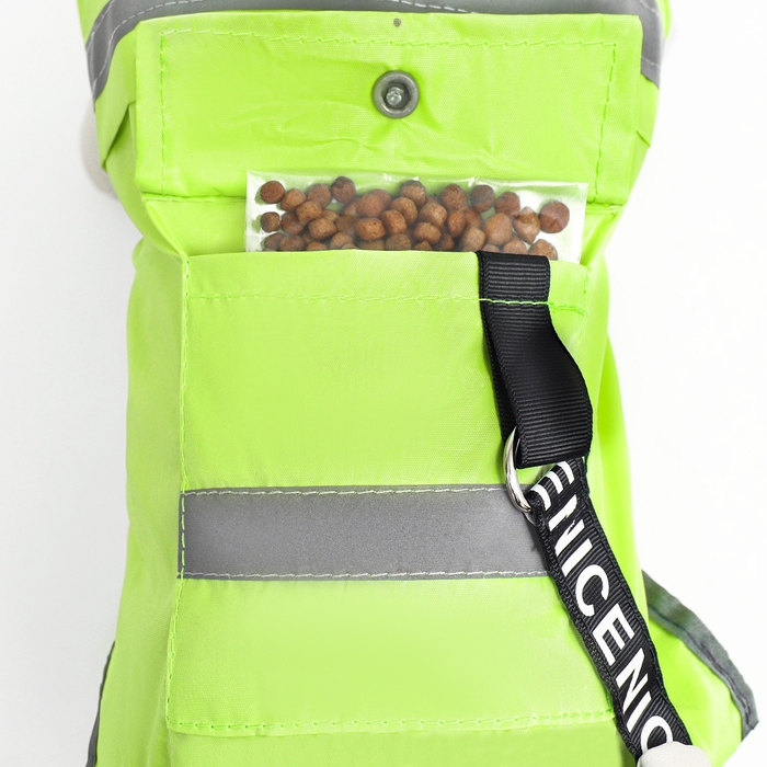 Также по всему комбинезону имеются светоотражающие полосы, отверстие для быстрого пристегивания поводка и кармашек для лакомств.