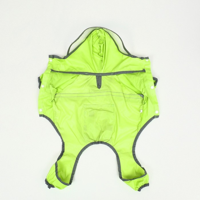 Комбинезон застегивается на кнопки, на лапах есть утягивающие резиночки, а на капюшоне есть прозрачный козырек, который защитит вашего питомца от ветра, пыли и дождя.