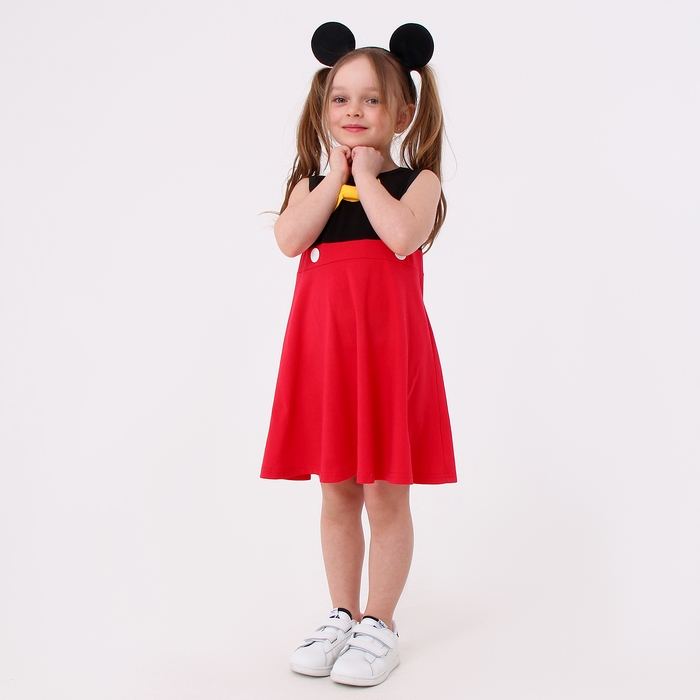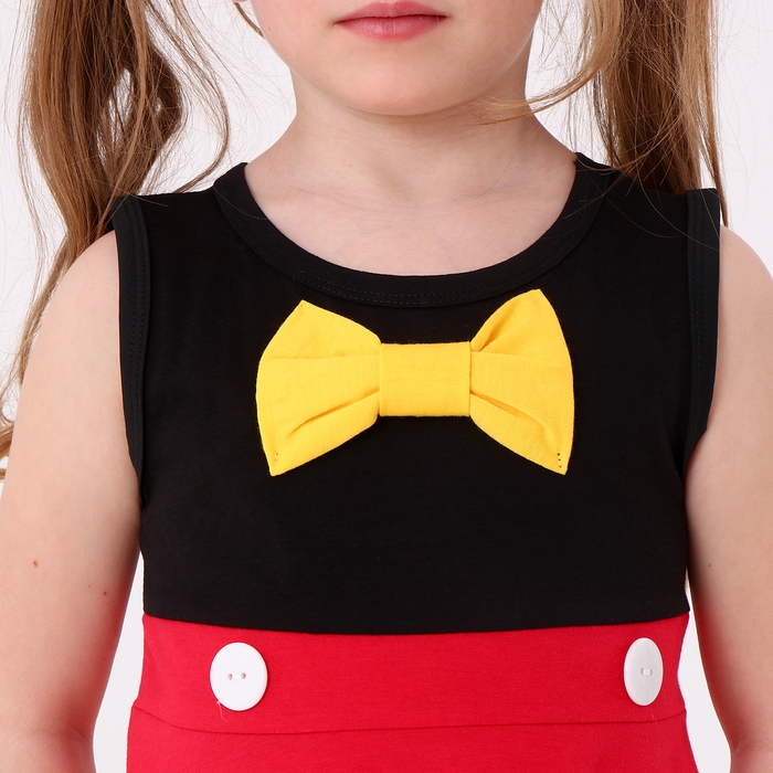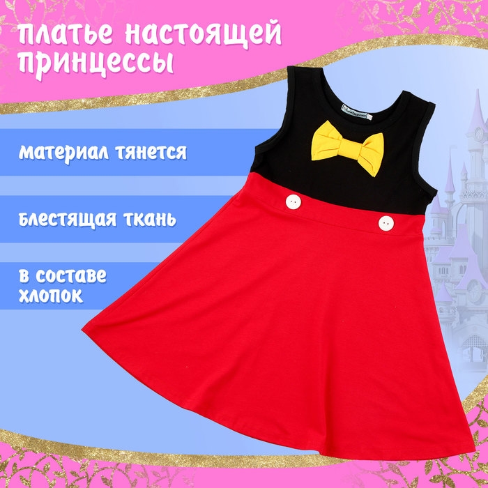 - Верх платья выполнен из черной ткани, а юбка – из яркой красной. Материал хорошо тянется и при этом обладает легким блеском. Благодаря натуральному составу, в платье будет комфортно даже при активных играх.