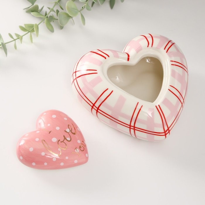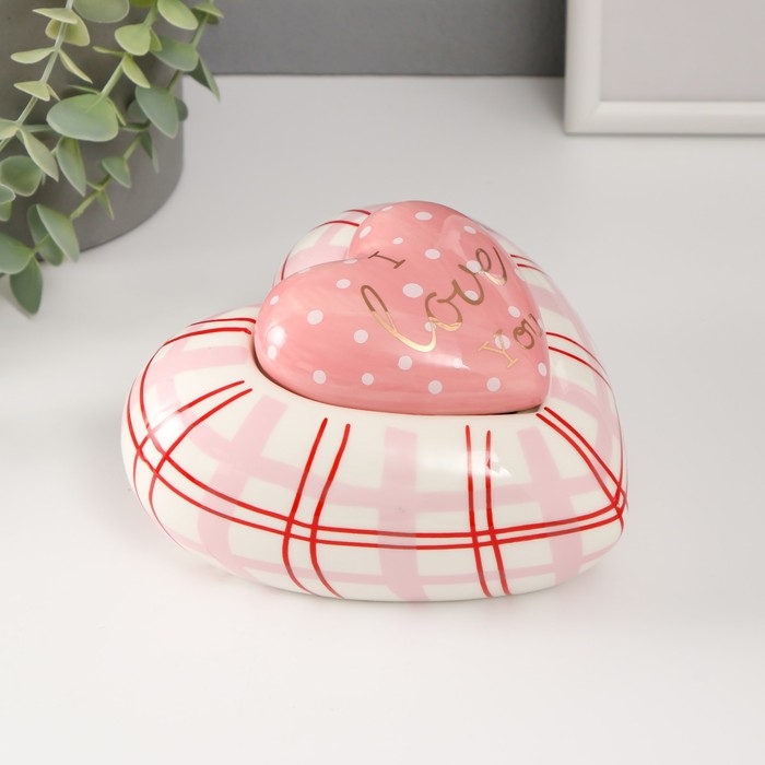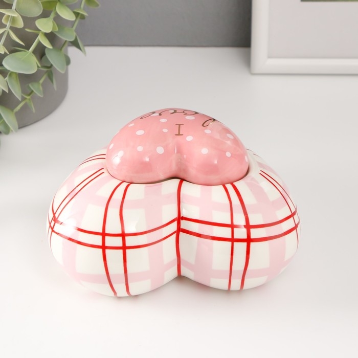Шкатулка керамика "Розовое сердце в горошек, в клеточку" 15,7х15,3х8,2 см