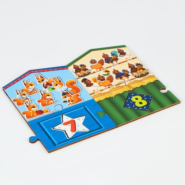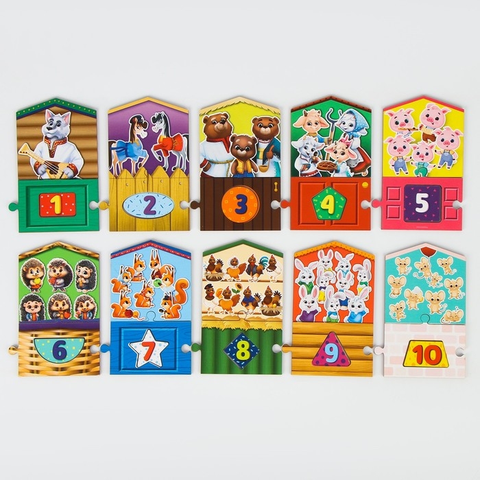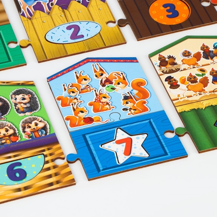- Посчитайте столько жильцов в каждом домике и присвойте ему правильный номер. Подсказкой для ребёнка будет форма плашки и окошка для цифры.