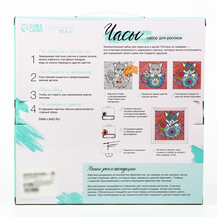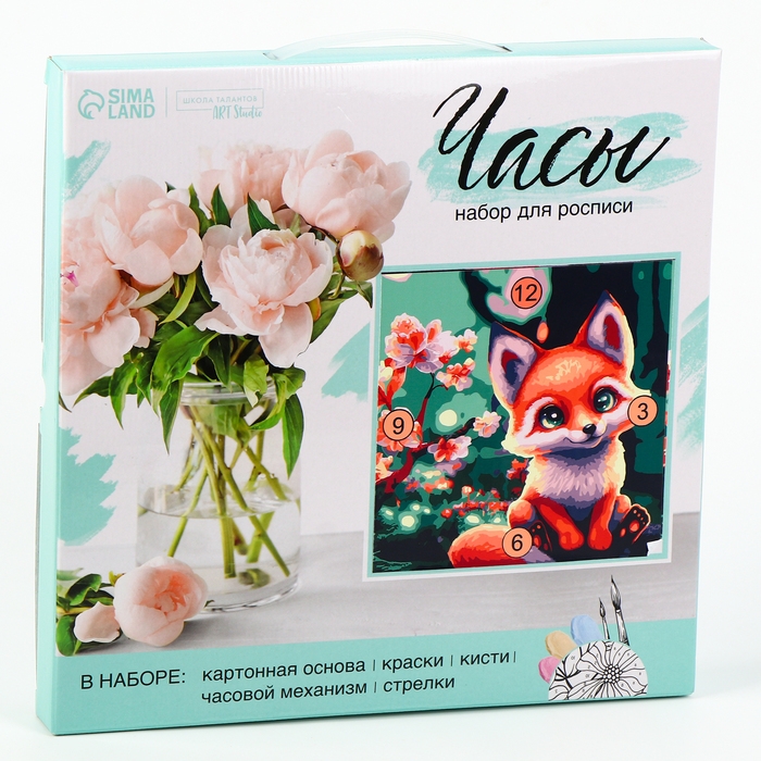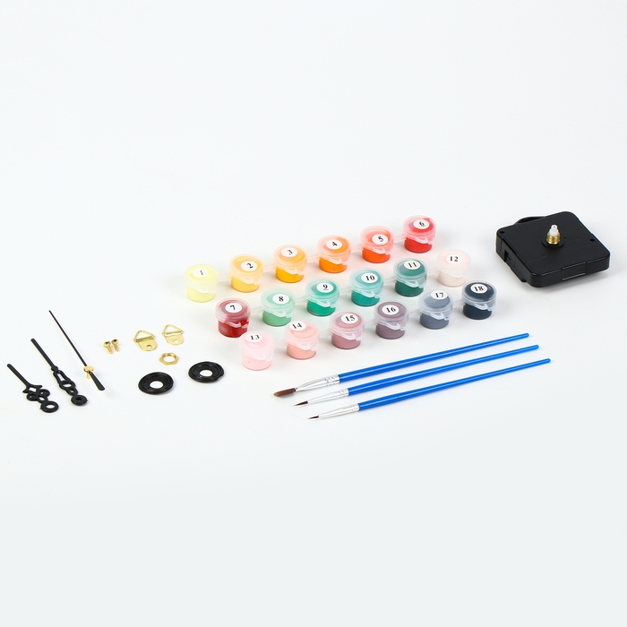 - В комплект входит картонная основа для часов, акриловые краски, кисточка, стрелки и часовой механизм.