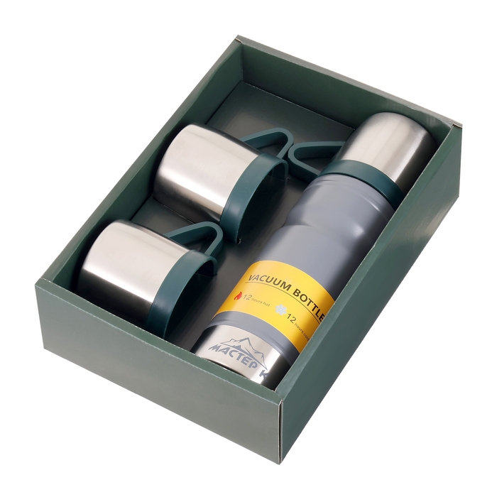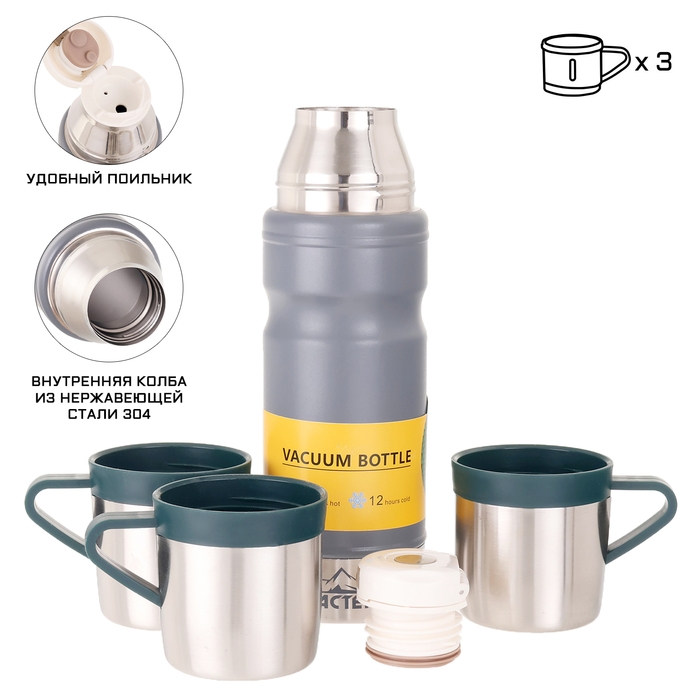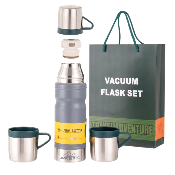 Набор "Мастер К": термос 680 мл и 3 кружки, сохраняет тепло 12 ч, серый