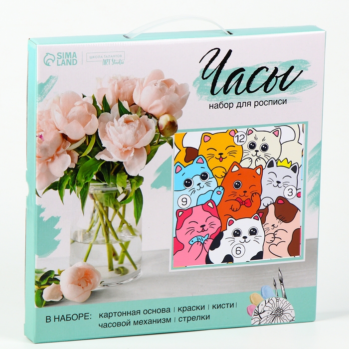 - В комплект входит картонная основа для часов, акриловые краски, кисточка, стрелки и часовой механизм.