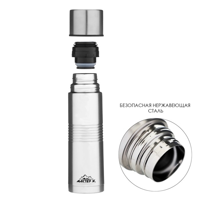 Термос, 1 л, Гильза "Мастер К", с кружкой, сохраняет тепло 24 ч, гарантия 5 лет, синий