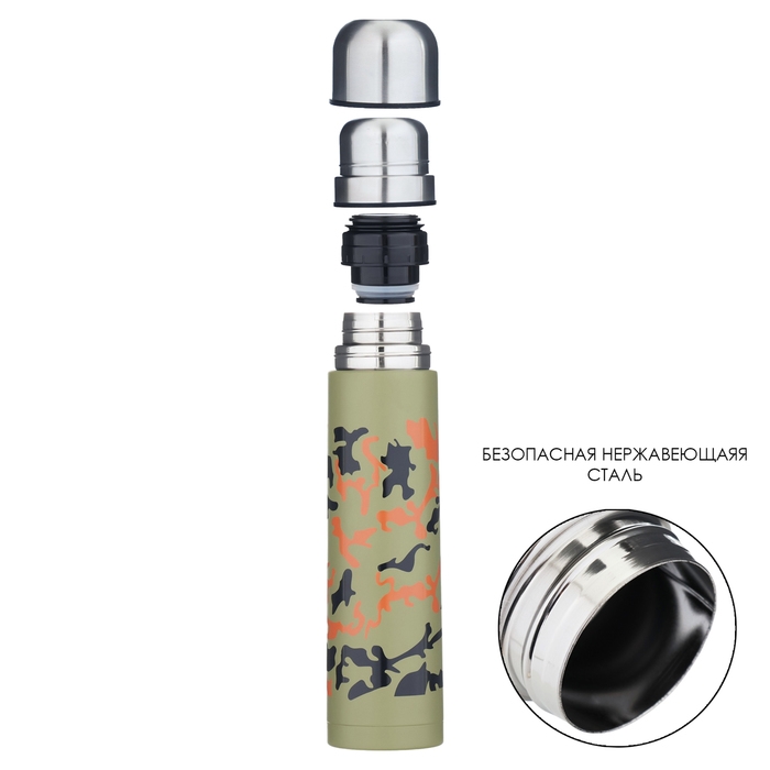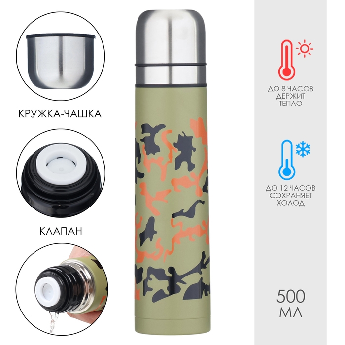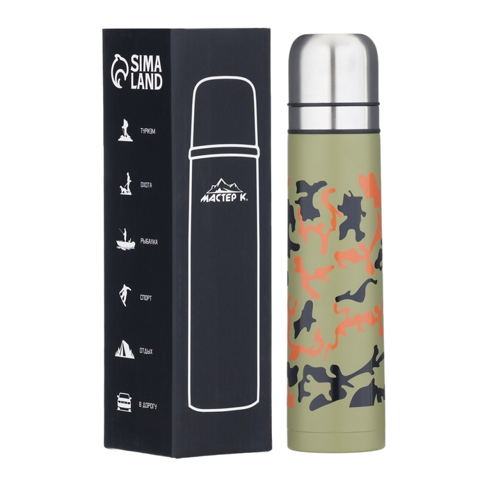 Термос, 1 л, Гильза Камуфляж "Мастер К", 1 л, с двумя кружками, сохраняет тепло до 12 ч