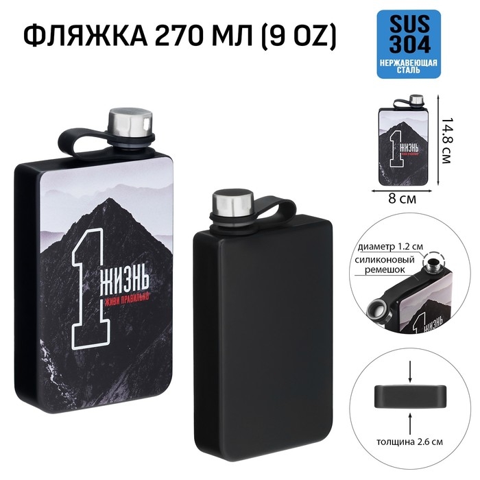 Фляжка для алкоголя "Одна жизнь. Живи правильно", нержавеющая сталь, 270 мл, 9 oz