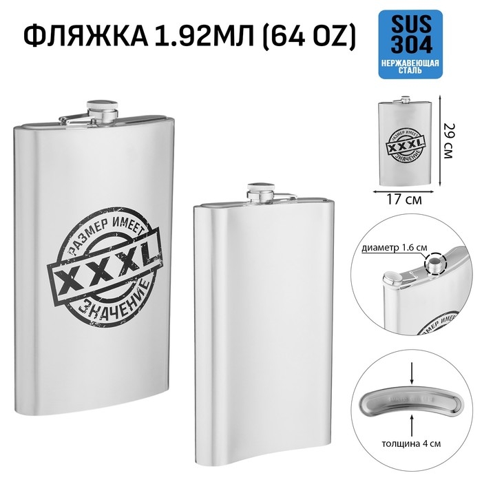 Фляжка для алкоголя и воды "Размер", нержавеющая сталь, подарочная, 1.92 л, 64 oz