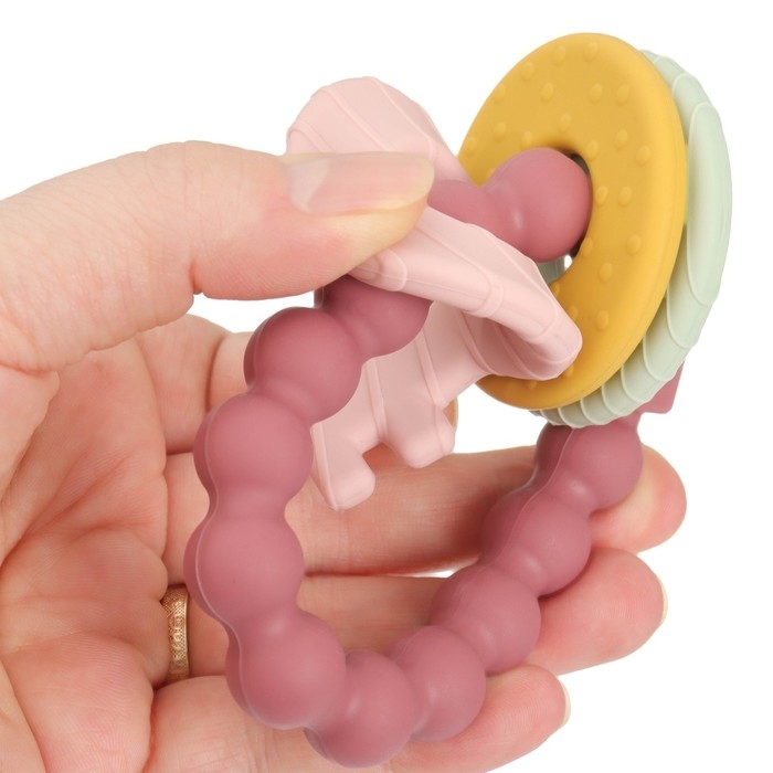 Прорезыватель снимает неприятные ощущения у малыша в период появления первых зубов. Также изделие подготовит ребёнка к процессу жевания, поспособствует формированию правильного прикуса и развитию мелкой моторики рук.