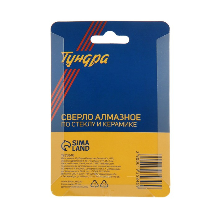 Сверло алмазное по стеклу и керамике ТУНДРА, трехгранный хвостовик, 45 х 65 мм