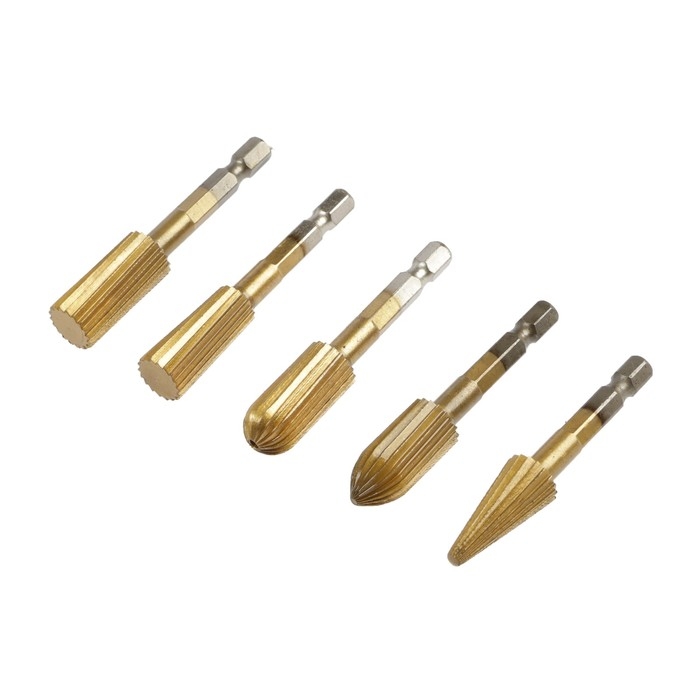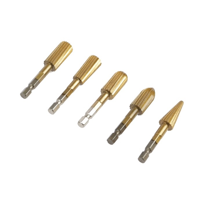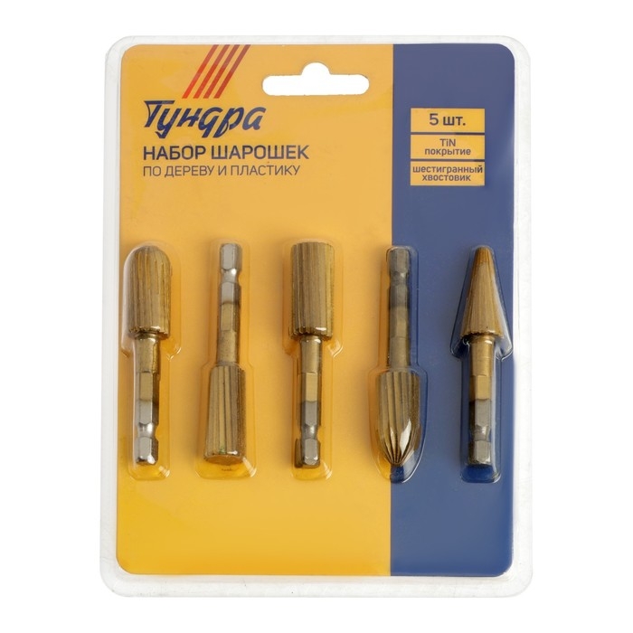 Набор шарошек по дереву и пластику ТУНДРА, TiN покрытие, шестигранный хвостовик, 5 шт.