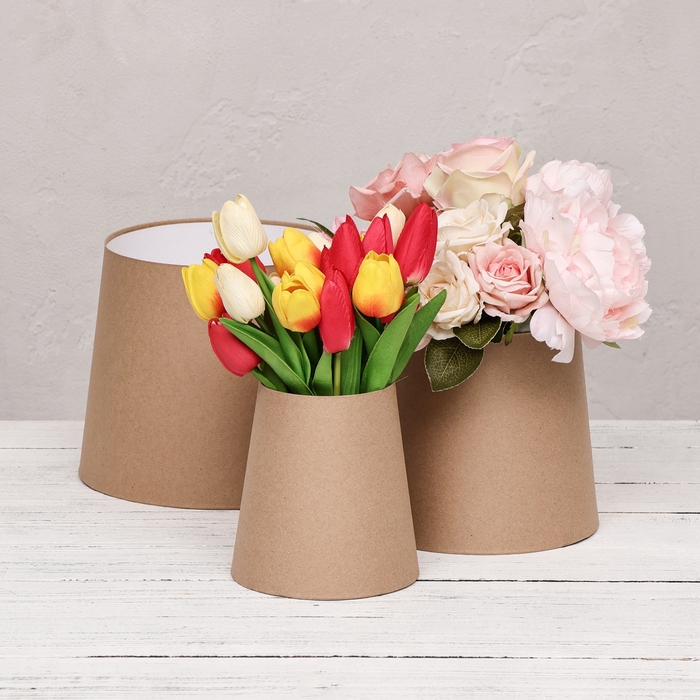 Коробки-конусы идеально подходят для упаковки букетов, цветочных композиций и отдельных видов цветов, таких как розы, тюльпаны или пионы. Благодаря своей форме, они обеспечивают надежную фиксацию цветов и защищают их от повреждений при транспортировке.